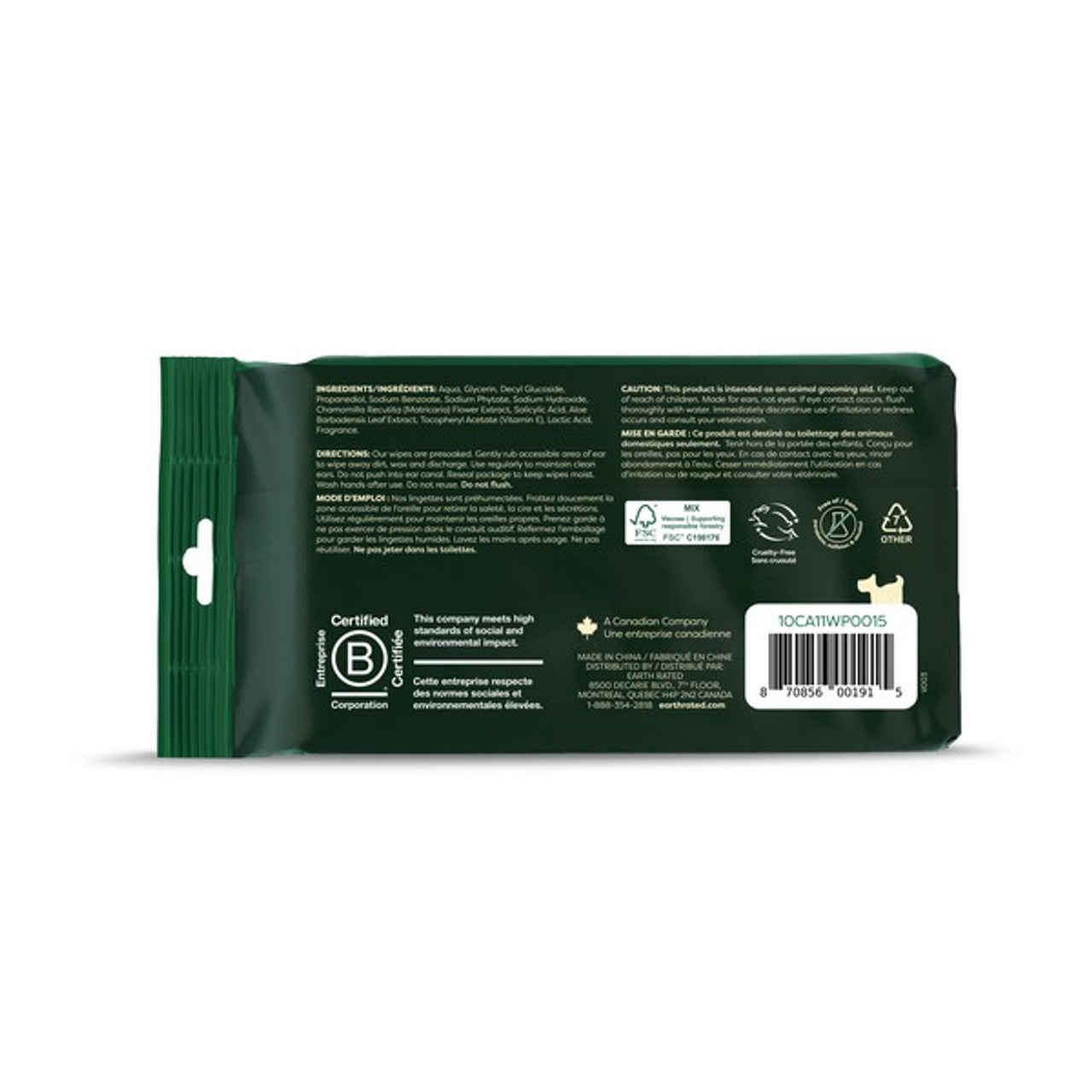 "Simplify ear care for your dog with easy to use Earth Rated Dog Ear Wipes. Hypoallergenic and formulated with soothing aloe vera, each wipe measures 5x5 inches and large enough to give both ears a good clean. Made from FSC-certified and FSC-controlled plant-based viscose fibres, this super soft material is durable enough to lift dirt, wax buildup, and unpleasant odors, gently and effectively. These wipes are Leaping Bunny cruelty-free certified and contain the perfect amount of moisture. The light Wild Oat scent keeps dogs ears smelling fresh. No added alcohol and free from parabens, sulphates, EDTA and propylene glycol. Earth Rated Dog Ear Wipes are thoughtfully designed to cleanse the sensitive folds, flaps, and fur of your dogs ears in just a few swipes."
